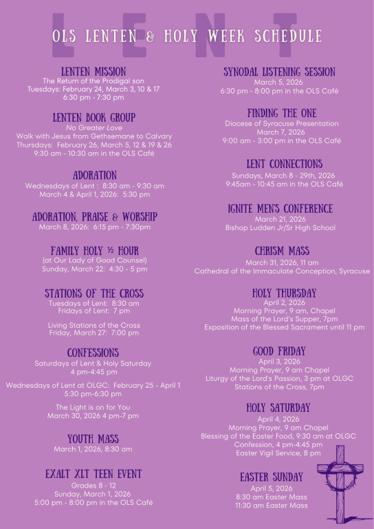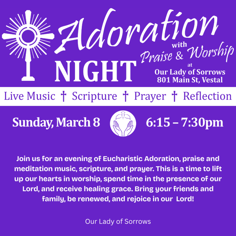 We will be offering a 4-week course starting Wednesday March 4th, at 6:30-7:30pm, in Room 11 in the school building so adults can be ready to be confirmed at the Easter Vigil in April. In the 4 weeks we will be discussing baptism, confirmation, and reconciliation. Here is a chance to complete the sacrament you might have missed in 4 short weeks! You’ll be glad you did! All study materials are provided at no cost! Any questions contact Diane Rigotti at diane@olsvestal.org