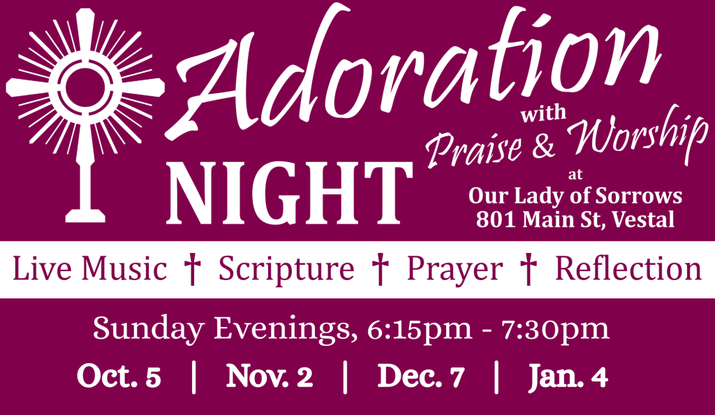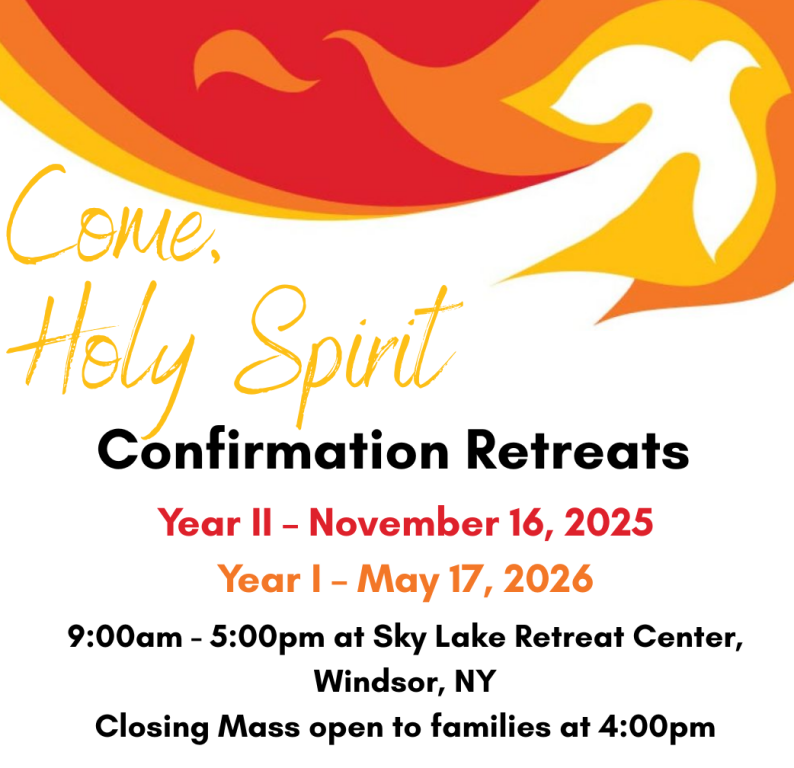 For information about First Reconciliation, First Communion, and Confirmation programs contact our office at (607) 748-8287.
