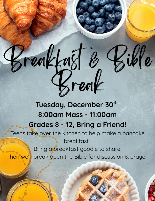 Join us for an evening centered around the Gospel for teens at OLS Gym/Cafe. We come together for dinner, play a group game, and beak open scripture with Fr. Prior. Open Gym starting at 5:30 pm!